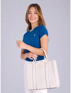 Bring modern sophistication to your everyday look with the USPA Box Tote with Crossbody Strap. Designed with a structured silhouette, this tote balances elegance and practicality. Featuring clean vertical panel details, a polished U.S. Polo Assn. logo plate, and gold-tone hardware, it adds a refined touch to any outfit. The detachable crossbody strap with bold logo detailing gives you hands-free versatility, making it perfect for workdays, weekends, and everything in between.