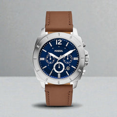 This watch features a 45mm round case paired with a striking blue sunray dial, elegantly complemented by a rich brown leather strap. The durable mineral crystal ensures longevity, making it perfect for everyday wear. The comfortable leather strap offers a timeless aesthetic, while the chronograph functionality provides precise timekeeping. Designed for those who value both style and practicality, this watch is an essential addition to any collection.