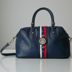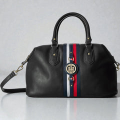 - TOMMY STYLE, TO GO: This must-have women’s handbag is polished off with the label’s signature logo stripe and glossy gold tone hardware featuring the TH medallion.
